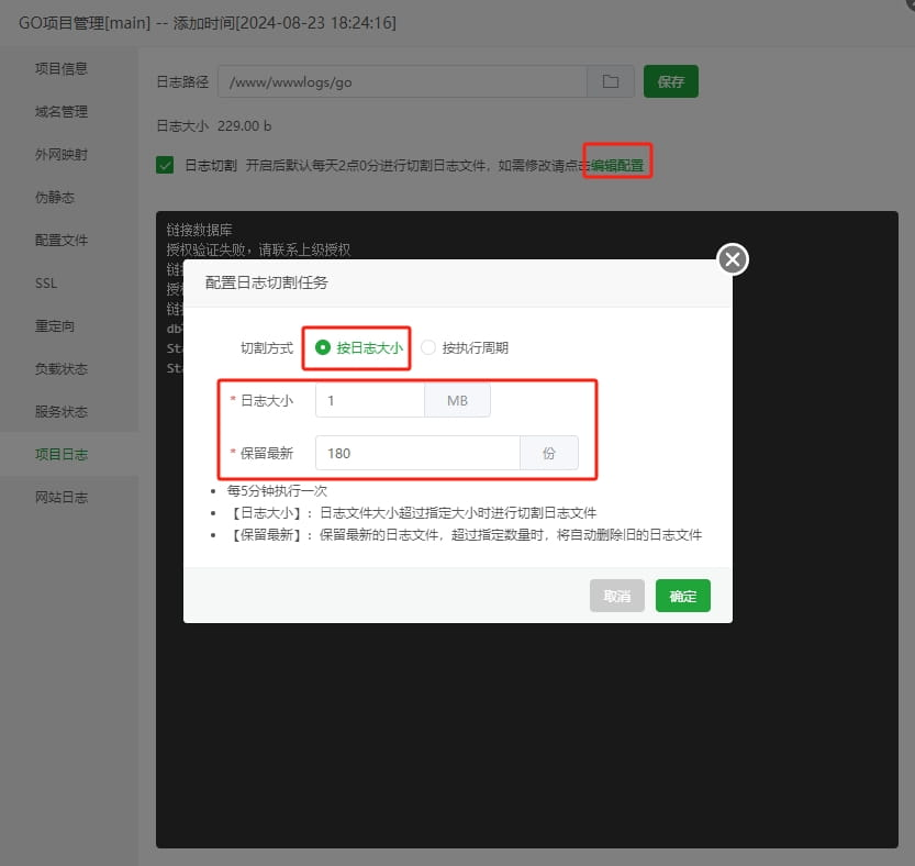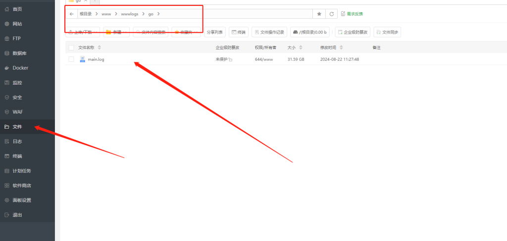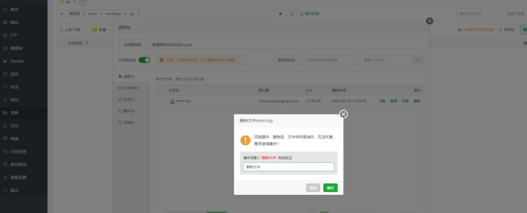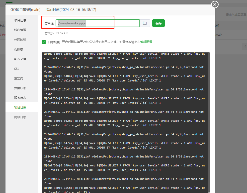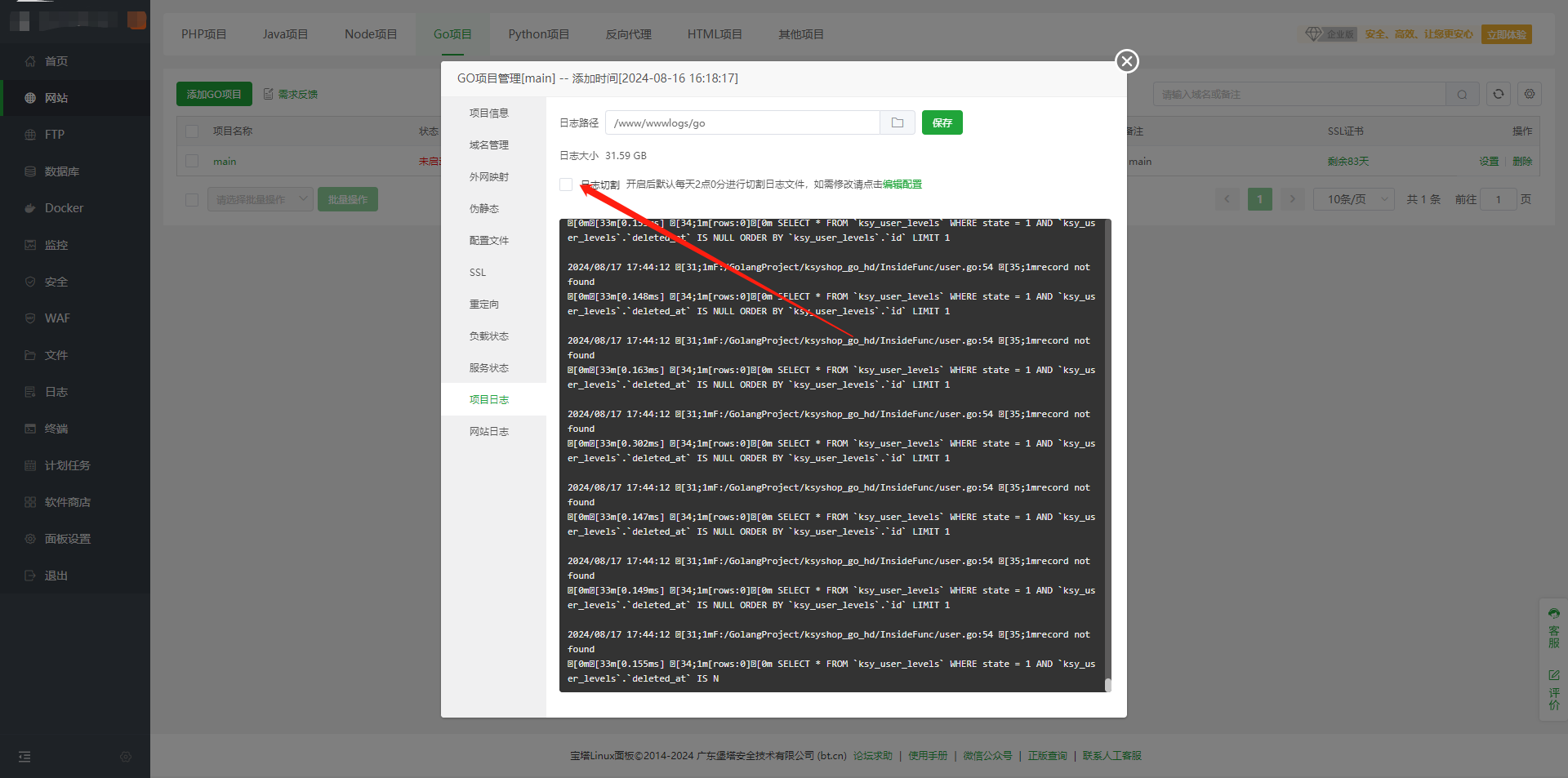 ceomax-pro主题已启用,当前站点还没有验证正版主题授权,暂不可使用 前往授权激活 或 获取正版授权。 我们有时候可能会看到上图情况,这种情况不用急惊慌,这是日志占满了硬盘 我们只需要打开日志切割,下次就不会出现这种情况了 然后我们清理掉之前产生的日志文件,复制日志路径 删除此文件,然后清空回收站 这个时候硬盘就恢复了,我们重新启动项目即可