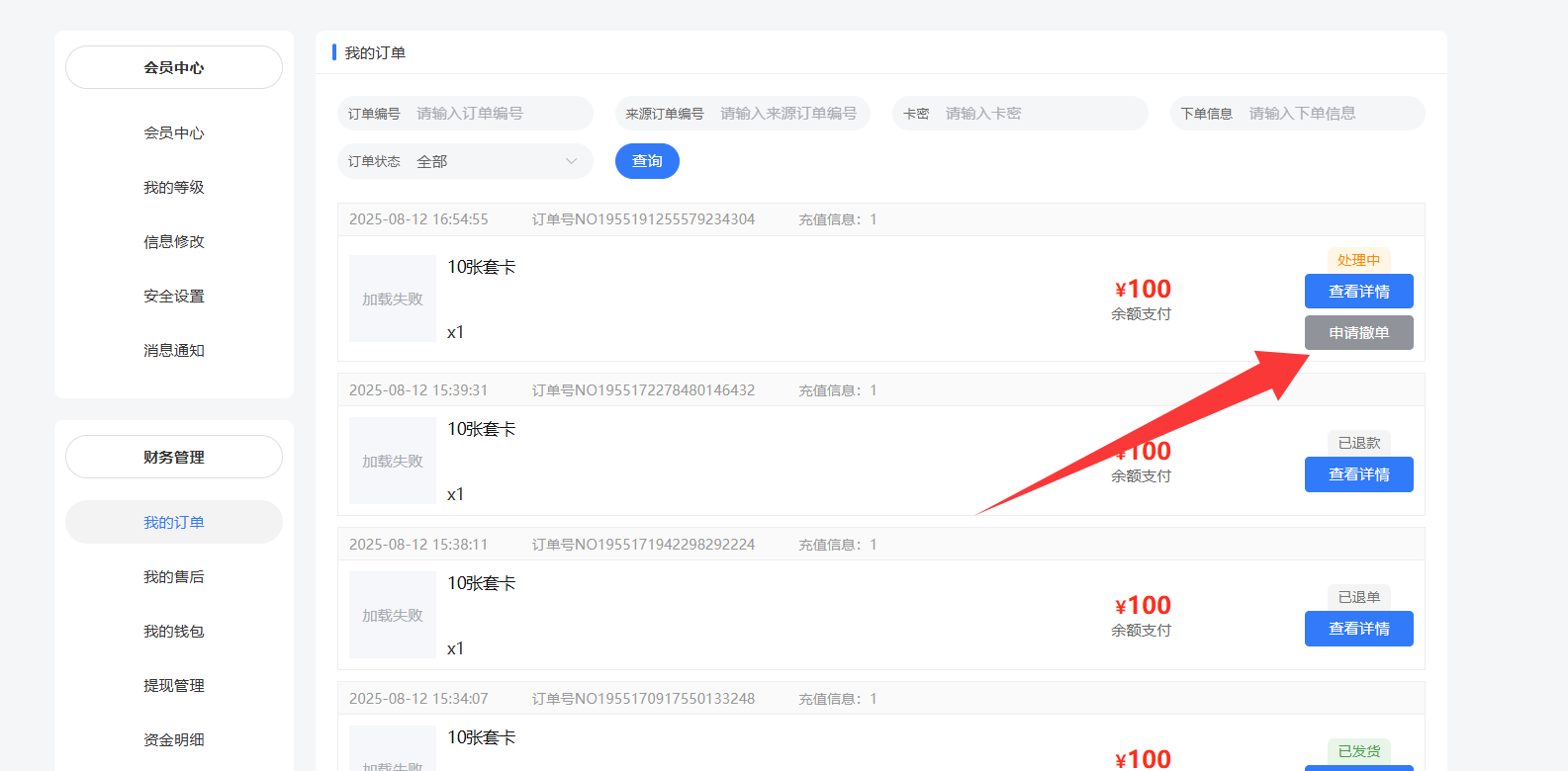 ceomax-pro主题已启用,当前站点还没有验证正版主题授权,暂不可使用 前往授权激活 或 获取正版授权。 打开管理员后台-用户-用户全局配置 打开管理员后台-商品列表-商品配置 用户在前台就可以对此商品申请主动撤单了